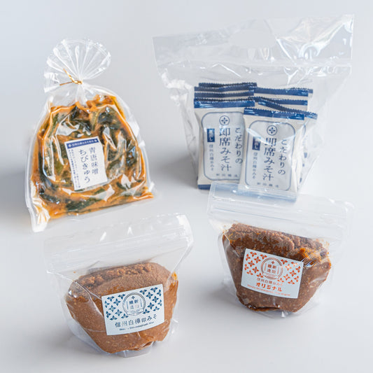 人気の2種のみそ、即席みそ汁、青唐みそちびきゅうの4点セットです。